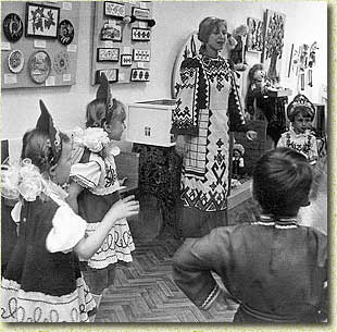 Основными экспонатами выставки стали поделки, выполненные руками воспитанников детских садов г. Орла, участвующих в экспериментальной программе «Народная культура», разработанной сотрудниками ООКМ. Это глиняные игрушки, куклы-закрутки (Живульки), макеты русской избы и крестьянского двора, вышивки в стиле «Орловский спис» и многое другое. На открытии выставки с концертом выступили малыши из центра развития ребенка д/с № 80. Автор экспозиции зав. научно-просветительским отделом Э. Л. Войнова. |