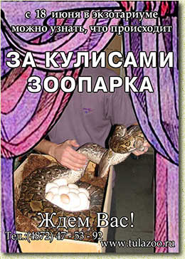 Экзотариум – это не только зоопарк для посетителей, и в этом вы убедитесь сами. Вы увидите то, чем пользуются сотрудники зоопарка для работы с ядовитыми и неядовитыми змеями, крокодилами, огромными питонами и черепахами. Узнаете о том, как люди помогают вылупляться малышам змеенышей, подбирают пары для спаривания, каким образом редчайшие пресмыкающиеся изучаются в природе и совершаются уникальные научные открытия, которыми Тульский областной экзотариум прославился на весь мир. |