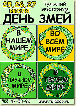 «День змей» — веселый традиционный праздник, который широко отмечался нашими предками, но был забыт в наши дни. Тульский экзотариум известен на весь мир благодаря своей огромной коллекции змей, поэтому было решено возродить эту добрую традицию, и впервые «День змей» в экзотариуме праздновался в 2007 г. В эти дни можно будет увидеть много разнообразных змей, услышать забавные суеверия о них, поучаствовать в «змеиных» обрядах, в общем, вдоволь пообщаться со змеями и узнать о них много интересного! |