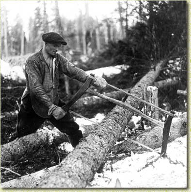 Раскряжевка дерева лучковой пилой канадским рабочим |
