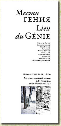 Люди помнят места. И места, в свою очередь, помнят людей. Спасское-Лутовиново и Михайловское, Кавказ и Кротуа несут в себе память о поэтах. Они созвучны поэтам. В них безошибочно угадывается дух и характер. Эти дома и деревья, поля и горы – свидетели жизни гениев, хранители памяти о них, носители «памяти места». Пространство выставки решено большими плоскостями цветных фотографий и чёрно-белой графики. Каждому писателю на выставке посвящён собственный зал, выставку открывает карта Европы, общего литературного дома; завершает – Париж, место символической встречи гениев. Монотипии немецкой художницы Якоб Кнапп (Jakob Knapp), фотографии Ивана Бойко, сделанные при помощи камеры обскуры, звуковые композиции, цитаты писателей, сознательно оставленные открытыми стены старой усадьбы создают метафорическое пространство: место встречи поэтов, эпох, языков, настроений, сюжетов. Контакт для прессы: тел.: 8 (495) 637-56-74. Email: lieudugenie@gmail.com Иллюстрации: http://dl.dropbox.com/u/541225/LIEU_DU_GENIE.zip Выставка продлится до 15 сентября 2010 г. в Государственном музее А.С. Пушкина по адресу: г. Москва, ул. Пречистенка, дом 12/2. |