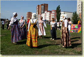 сидящие на зеленой траве барышни в народных костюмах учили зрителей