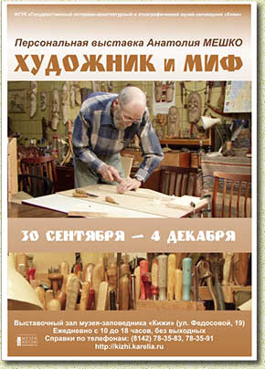 искусства. Физик по образованию, он нашел себя в искусстве как художник-прикладник, мастер по изготовлению музыкальных инструментов. Тесная связь его работ с народной мифологией стала главной темой выставки. Дерево — любимый материал мастера и один из основных символов народной мифологии. Еще в недавнем прошлом люди поклонялись священным деревьям и рощам и наделяли их живой душой. В работах мастера это нашло отражение в ликах, выполненных из древесных наростов, которые, по мнению Анатолия Валентиновича, являются «духами» деревьев. Сложные сплетения корней и необычные формы сучков пробуждают воображение и заставляют искать знакомые, подсказанные мастером образы, будь то змея, птица или единорог, подобно древнему человеку, стремящемуся познать и освоить чужой, незнакомый ему мир. Мифологические представления людей о «чужом» мире и его жителях нашли отражение в декоративных масках, изготовленных мастером. Это домовые и лешие, облики которых созданы на основе быличек, рассказывающих о встрече с этими существами. Когда-то они пугали и настораживали людей, теперь их образы призваны служить оберегом и украшением дома. Стремление мастера актуализировать образы традиционной мифологии послужило поводом к созданию работ, которые могут быть использованы в современном интерьере и декоре жилья, — барельефов, скульптур малых форм, домашней утвари. Особое место в творчестве А.В. Мешко занимает изготовление музыкальных инструментов. На волне национального подъема в 1980-90-х годах он одним из первых обратился к изготовлению традиционных карельских, вепсских и русских музыкальных инструментов для фольклорных коллективов Республики Карелия, в том числе и Фольклорно-этнографического театра музея-заповедника «Кижи». На выставке представлены реконструкции и копии традиционных музыкальных инструментов, выполненные на основе изучения музейных коллекций и архивных данных, а также инструменты авторских форм, ставшие новым словом мастера в этой области творчества. Художественно-образные формы, заимствованные у природы, по мнению Анатолия Валентиновича, усиливают восприятие современным человеком как самого инструмента, так и исполняемой на нем музыки. Результаты своих творческих исканий А.В. Мешко опубликовал в различных изданиях Карелии и Финляндии, в 1992 году вышла его брошюра «Дерево в нашем доме». Мастер регулярно выступает с докладами на тему музыкальных инструментов и народной мифологии на семинарах в Карелии, Санкт-Петербурге и Финляндии. Его работы участвовали в республиканских, зональных, российских и зарубежных выставках. Выставка, сопровождающаяся демонстрацией фильмов «Кантеле творец искусный», «Слово мастера», аудиозаписями игры на музыкальных инструментах, творческими заданиями, продолжит свою работу до 4 декабря 2011 г. Над выставкой работали: Авторы выставки — Наталья Михайлова, ст. н. сотрудник отдела фольклора; Елена Герасимова, специалист по фольклору отдела фольклора. Художественное оформление выставки — Ирина Панкова, художник-дизайнер. Мультимедиа сопровождение выставки — Сергей Безручко, программист; Евгений Михайлов. Организационное обеспечение — Лиана Степанова, зав. выставочным комплексом музея-заповедника «Кижи».