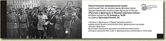 Выставка посольства Франции в России представляет собой впервые опубликованные редчайшие документы, обнаруженные в архивах военных ведомств Франции. Это совместный проект российской сети французских центров «Альянс Франсез». Выставка уже побывала во Владивостоке, в Новосибирске, Иркутске, Перми, Казани, где имела огромный успех. Выставка посвящена русскому экспедиционному полку, который сражался бок о бок с французскими солдатами в 1916 году, а также французским войскам. 8 февраля 2012 г., на выставке «Русские и французы в Первой мировой войне» в рамках акции «Зимний Музейный Пикник» будет организован специальный показ документальных кадров военных лет на французском языке (с субтитрами на русском языке), а так же зрителям будет показан документальный фильм «От Москвы до Вердена». Вход на выставку свободный. О фильме: От Москвы до Вердена, реж. Марсела Ферару, Франция, 2010 г. – 52 мин В декабре 1915 г. будущий Президент Франции Поль Думе едет в Петроград, чтобы просить царя Николая II о военной поддержке. 40 000 русских солдат отправляются на помощь французским войскам, они примут участие в жесточайших сражениях на северо-востоке Франции, которые позволят прорвать Линию Гинденбурга. После в 60-дневного морского путешествия из Владивостока, преодолев 30 000 км пути в тяжелейших условиях, весной 1916 г. русские войска высаживаются в Марселе. Прибытие подкрепления поднимает дух местного населения. Гладнева Мария «Альянс Франсез Тольятти» МУК «Тольяттинский краеведческий музей» |