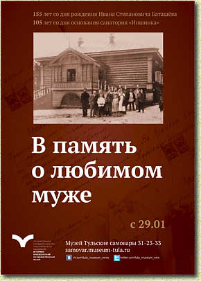 Выставка приурочена к 155-летию Ивана Степановича Баташёва – представителя знаменитой тульской самоварной династии и 105-летию основания санатория «Иншинка». Вниманию туляков предстанут уникальные семейные фотографии Ивана Степановича и его жены Александры Васильевны, личные вещи семьи, хирургические инструменты и аптечные пузырьки с лекарствами, датируемые концом XIX века, редкое книжное издание по русской хирургии из личного архива знаменитого Тульского врача, краеведа, путешественника Григория Витальевича Соболевского, а также поделки и рисунки детей, пребывающих на отдыхе и лечении в санатории «Иншинка». |
