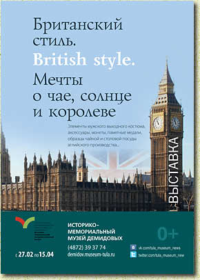 Выставка приурочена к старту перекрестного года культуры Великобритании и России, событию, призванному как можно более полно рассказать о богатых и разнообразных культурных связях двух стран, объединяющих их историю и традиции. Тема выставки – время правления королевы Виктории, так называемая «Викторианская эпоха» (1837–1901). В истории Англии этот период считается самым значимым – бурно развивались наука и культура, формировались новые вкусы и настроения, утверждался мужской образ джентльмена. Гостям музея представят элементы выходного мужского костюма, аксессуары, монеты, памятные медали, английский фарфор и многое другое. |