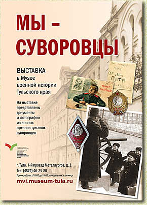 суворовцев, форму, погоны, награды и многие другие предметы. Выставка продлится до 30 июня 2014 г. Приглашаем посетителей всех возрастов (0+). Суворовские училища были созданы во время Великой Отечественной войны Постановлением Совета Народных Комиссаров СССР и названы в честь доблестного русского полководца А.В. Суворова. Перед училищами ставилась задача подготовить мальчиков к военной службе в офицерском звании и дать им общее среднее образование. Тульское суворовское училище выпустило достойных граждан своей страны. Около 150 суворовцев успешно защитили кандидатские и докторские диссертации, стали заслуженными работниками культуры, заслуженными деятелями науки и техники, профессорами, изобретателями. С честью выполняли свой интернациональный долг, участвуя в боевых действиях в «горячих точках», ликвидации последствий аварии на Чернобыльской атомной электростанции. Место проведения: Тула, Пролетарский район, 1-ый проезд Металлургов, д.3. Контактный телефон 8 (4872) 46-25-80. Музей военной истории Тульского края, филиал ГУК ТО «Объединение «Историко-краеведческий и художественный музей» 300031, г. Тула, 1-й проезд Металлургов, д.3 Тел./ факс (4872) 46-25-80 E-mail: mvi@museum-tula.ru Сайт http://mvi.museum-tula.ru/, www.museum-tula.ru |