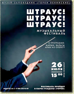 Перед гостями фестиваля выступят оркестр и солисты Московского академического Музыкального театра имени К.С. Станиславского и В.И. Немировича-Данченко. Дирижер фестиваля – заслуженный артист России, дирижер Венского бала Феликс Коробов. В программе прозвучат произведения, Иоганна Штрауса-отца, Иоганна Штрауса-сына, а также Рихарда Штрауса. Фестиваль пройдет в историческом парке старинной дворянской усадьбы «Горки», расположенной в 12 километрах от Москвы. Гостей фестиваля ждет незабываемое музыкальное путешествие в мир популярной классической музыки. |
