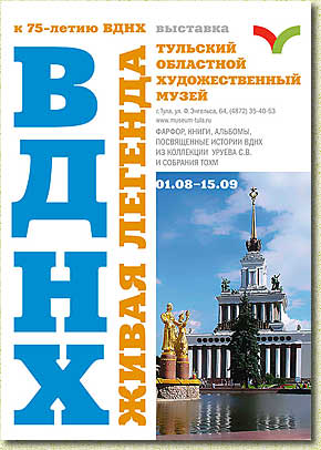 1950-е гг.). Фарфоровые тарелки, кувшины, вазы, чашки, шкатулки с изображением павильонов ВСХВ, альбомы открыток, путеводители, книги и многое другое. Визуальный ряд дополняет ваза из молочного стекла с рисунком знаменитой скульптурной группы С.М. Орлова |