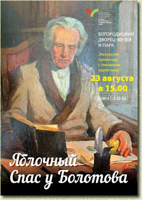 Мало кто знает, что наш знаменитый земляк Андрей Тимофеевич Болотов является основоположником помологии – научной дисциплины, которая занимается изучением сортов плодовых культур. Он вывел несколько сортов яблок, одно из них назвал Болотовкой, другое Андреевкой для увековечивания своего имени. Обо всем об этом и многом другом из жизни тульского энциклопедиста можно будет узнать из театрализованной экскурсии-прогулки по залам музея и по территории парка, которая состоится в 15.00 ч. 23 августа 2014 г. Приурочена она к любимому празднику Андрея Тимофеевича – Яблочному Спасу. Гостей ожидают занимательные и поучительные истории. |