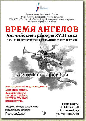 Выставочный проект компании «АРТГИТ» и Ростовского областного музея изобразительных искусств «Время Ангелов. Шедевры английской гравюры XVIII века» впервые представляет российскому зрителю величайшее наследие английского графического искусства XVIII века – признанные шедевры графики из всемирно известного цикла «Библия Маклина» в его полном объеме – все 70 полностраничных резцовых гравюр и 10 гравированных виньеток. Уникальность экспозиции подчеркивает тот факт, что в российских музеях полного собрания гравюр из цикла «Библия Маклина» нет. История создания гравюр и выпуска Библии Томасом Маклином напрямую связана с эпохой становления и развития английской школы живописи. |