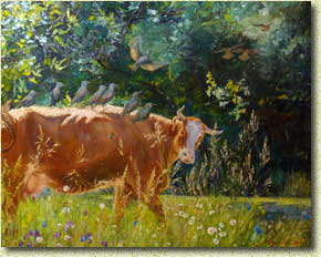 художников России. Представленные на выставке работы – свидетельство поиска автором оригинальных живописно-пластических решений. В пейзажах, натюрмортах, жанровых полотнах проявляется стремление художника найти свой почерк, отразить в работах особенности своего художественного видения. В центральной части экспозиции внимание на себя обращает дипломная работа живописца «Когда зацветает миндаль». Здесь же представлены его ранние работы, написанные в сдержанной цветовой гамме – «Городская окраина», «Ай-Петри: Корона Крыма». В картине «Сумерки» живописцу удалось передать особую атмосферу вечернего города, когда сгущаются сумерки, в окнах многоэтажек зажигаются огни, а мягкий вечерний свет придаёт созданному образу романтичность. В картинах Ивана Кудрявцева, выполненных в последние годы, красочная палитра становится ярче и насыщенней, в них проявляется позитивное, жизнеутверждающее начало. Живописные образы, созданные автором, говорят о его искренней любви к природе, ко всему живому. Звучным колоритом, радостной атмосферой солнечного летнего дня привлекает картина «Малышка», главным героем которой стала очаровательная представительница животного мира – корова Малышка. Картина как будто наполнена звуками и запахами природы, напоённым солнцем воздухом. В этой работе, а также в полотнах «Стога», «Вечер на Цне» и др. ярче видны особенности живописного языка художника – сочетание гладкой живописной поверхности с пастозными, объёмными мазками. Стремление передать особенности формы, материальность, фактуру изображённых предметов нашло отражение в его натюрмортах «Чистый четверг», «Медовый спас». В работе «Погожий денёк» И.Кудрявцеву удалось передать яркие краски зимнего дня в морозный солнечный день. Блики и рефлексы на снегу и крышах домов, чистое лазурное небо помогают почувствовать атмосферу радостного «погожего денька». Иван Кудрявцев – участник всероссийских, зональных, областных художественных выставок. Его работы находятся в Тамбовской картинной галерее, в частных коллекциях России и за рубежом. В 2014г. он стал стипендиатом Союза художников России и Министерства культуры РФ. Творческая биография автора только начинается. Хочется пожелать художнику смелости и активности в поисках интересных тем и новых художественных открытий. Татьяна Сутормина ТОГУК «Тамбовская областная картинная галерея» |