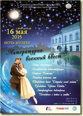 Какой разговор повести с посетителями музейной ночи в год 70-летнего юбилея Великой Победы и в Год литературы в России, напрашивается само собой. Сотрудники Музея истории города Ярославля объединили две важные темы в одну и приглашают ярославцев участвовать в литературно-военном квесте. Квест – слово иностранное, но, как и многие другие иностранные слова, планшет, например, прижилось у нас. Кстати, именно о планшетах предлагается на время забыть и вспомнить, как шуршат странички настоящей книги, поэтому для ярославцев придумали выгодную акцию. Тот, кто хочет прийти на музейную ночь в Музей города совершенно бесплатно, должен сфотографировать себя с книгой, выложить фото в группе |