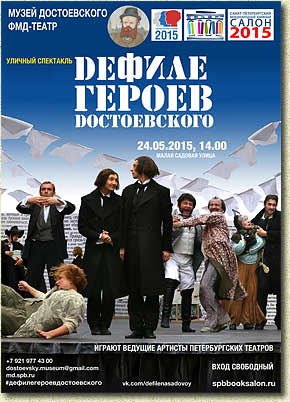 Яркое ироничное шоу ФМД-Театра (Театра Музея Достоевского) «Дефиле героев Достоевского» создано в рамках петербургского праздника «День Достоевского» Спектакль с большим успехом прошел в Петербурге, в Москве и Стамбуле. 24 мая в 14.00 у петербуржцев есть возможность увидеть его еще раз на Малой Садовой улице. Жители и гости Петербурга увидят Раскольникова и Алену Ивановну, Князя Мышкина и Рогожина, Настасью Филипповну и Аглаю, братьев Карамазовых, Ставрогина, Хромоножку, двойника и многих других в исполнении ведущих актеров петербургских театров. |