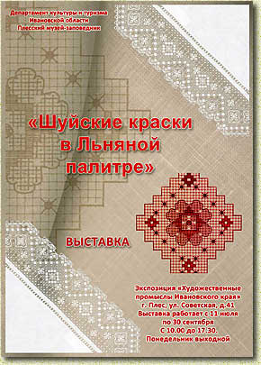 области шуйской вышивки. Предполагается проведение мастер-класса по вышивке. Открытие выставки состоится 11 июля в 11.00 в экспозиции «Художественные промыслы Ивановского края» по адресу: г. Плес, ул. Советская, 41. ОГУ «Плесский государственный историко-архитектурный и художественный музей-заповедник» 155555, Ивановская область, Приволжский район, г. Плес, ул. Луначарского, д. 6 Тел./факс (49339) 4-34-90 Тел. (49339) 4-37-82 (экскурс.) E-mail: ples@mail.ru Сайт: www.plyos.org |