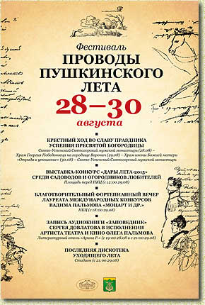 28–30 августа 2015 года впервые пройдет фестиваль «Проводы Пушкинского лета». Его организуют: районная администрация, Святогорский монастырь, Государственный музей-заповедник А.С. Пушкина «Михайловское» и фонд «Царскосельский карнавал». В программе фестиваля – рассчитанные на различную аудиторию акции. Так, в рамках фестиваля по Святогорью пройдёт трехдневный крестный ход. В пятницу, 28 августа, в день, когда Русская Православная Церковь отмечает двунадесятый праздник Успения Пресвятой Богородицы, после праздничной Божественной литургии в Святогорском монастыре православные пойдут крестным ходом в воссозданную на городище Воронич церковь во имя Георгия Победоносца. В рамках фестиваля состоится благотворительный концерт – фортепианный вечер лауреата международных конкурсов Вадима Пальмова. |