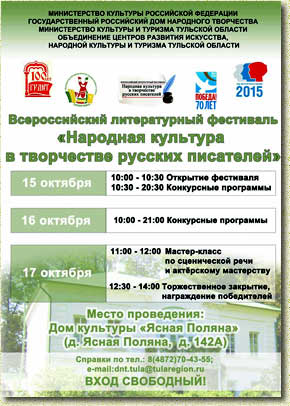 Узловая. Исполнители покажут постановки (мини-спектакли, отрывки из спектаклей) по мотивам произведений Александра Пушкина, Николая Гоголя, Александра Островского, Федора Достоевского, Антона Чехова, вспомнят поэтесс Марину Цветаеву и Анну Ахматову. Оценивать выступления будут известные деятели культуры и искусства. Председатель жюри – режиссер Большого театра России, доцент кафедры режиссуры и актерского мастерства музыкального театра Российского университета театрального искусства (ГИТИС) – Сергей Алексеевич Терехов. По окончанию конкурсных мероприятий участников фестиваля ждет круглый стол и мастер-классы по сценической речи и актерскому мастерству. 17 октября 2015 года в 12:30 в Доме культуры «Ясная Поляна» состоится торжественная церемония награждения победителей фестиваля. Вход на мероприятие свободный. Приглашаем всех желающих! Организаторы мероприятия: Министерство культуры Российской Федерации, Государственный Российский Дом народного творчества, Министерство культуры и туризма Тульской области, Государственное учреждение культуры Тульской области «Объединение центров развития искусства, народной культуры и туризма», Государственный мемориальный и природный заповедник Музей-усадьба Л.Н. Толстого «Ясная Поляна». Всероссийский