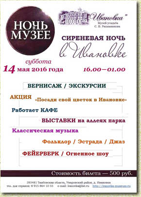 Программа мероприятий «Сиреневой ночи» начнет свою работу в 16:00 и продлится до 01.00. Посетителям буду предложены новые экспозиции, выставки, концерты, презентации, экскурсии, угощение и многое другое. Программа праздника будет включать в себя большой спектр мероприятий. На аллеях парка расположатся выставки и вернисажи. Пройдут экскурсии по залам Музея и усадьбе. Гости будут участвовать в акции «Посади свой цветок в Ивановке». Состоятся презентации новых изданий Музея-усадьбы: нотного сборника «Рахманинов С.В. Избранные пьесы»: переложение для фортепиано в 4 руки Л.Н. Егоровой и буклета «С. Прокофьев и С. Рахманинов» автор-составитель Е.В. Кривцова. |