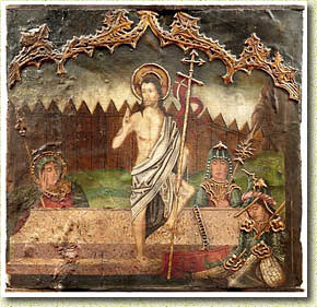 жесте, в левой – он держит длинный крест со знаменем. Вокруг гроба