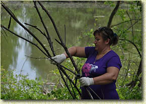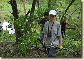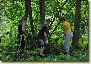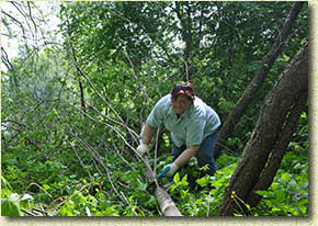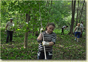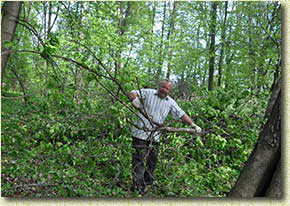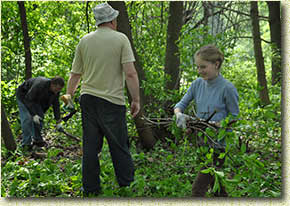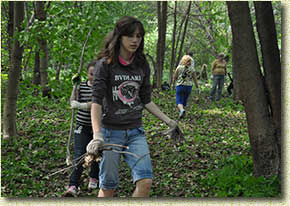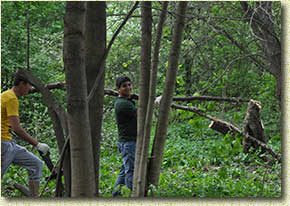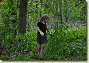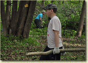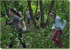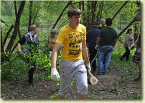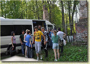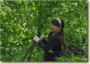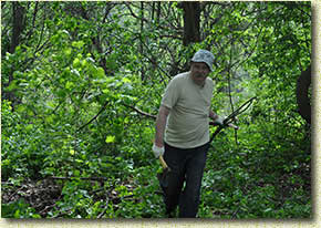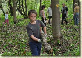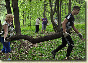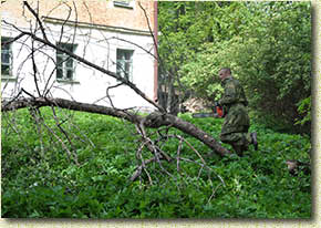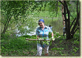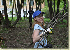Нас приехало почти двадцать человек из Ясногорска и Тулы: учащиеся и преподаватели Ясногорского технологического техникума, сотрудники Ясногорского историко-художественного музея и члены их семей, члены Ассоциации музейных работников. Перед школой царил идеальный порядок, нарушенный только велосипедами учеников, лежащими на траве в тени лиственничной аллеи. Даже вкралось сомнение: а что же будем делать мы, двадцать человек, вооруженных бензопилой, топориками и секаторами. Но зайдя за угол дома, поняли, что помощь наша не просто нужна, но и необходима. |